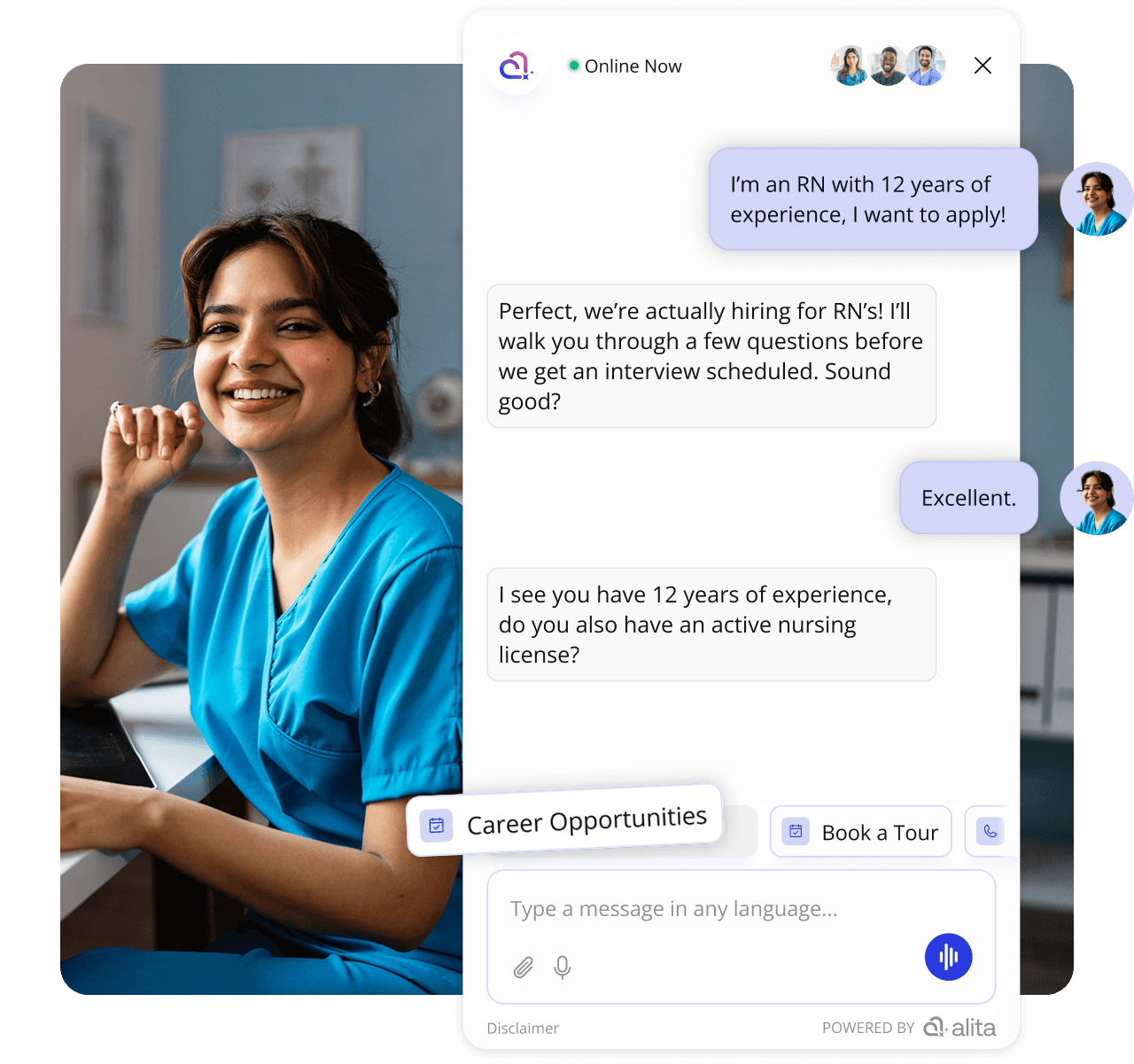 Alita gathers requirements, checks eligibility, and runs job-specific screening. Wrong location, credentials, or service? Your team never sees them.